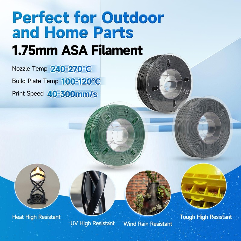 - Heat&Highly Weather Resistant UV-Stability: FilaBees ASA 3D printing filament has the characteristics of High strength, Impact modified, weather resistance, UV-stability. Suitable for outdoor/sports, electrical appliances, automotive and other industries, such as exterior mirrors, radiator grids, durable equipment casings, etc