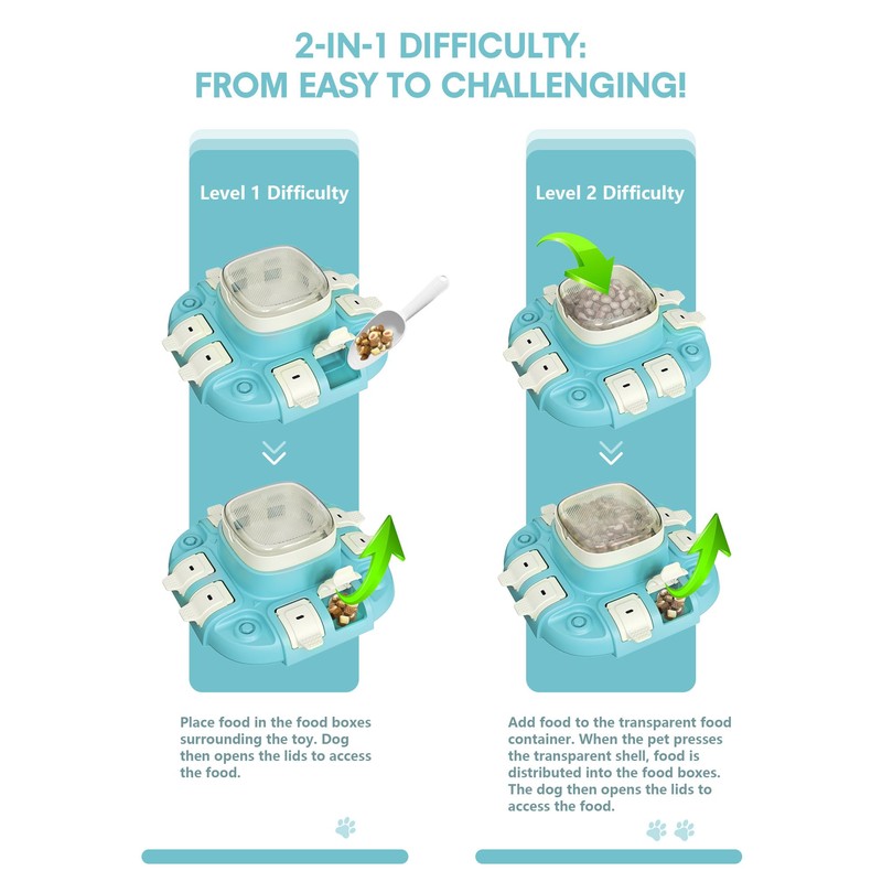 • 2 Difficulty Levels in 1 Dog Enrichment Toy: Start with Level 1, where your dog can nudge the base compartments to access their tasty treats. Once they've mastered Level 1, move on to Level 2 by placing treats in the top compartments. Your dog will need to press the top cover to release the treats into the base compartments, rewarding them with a delicious snack and a sense of accomplishment.