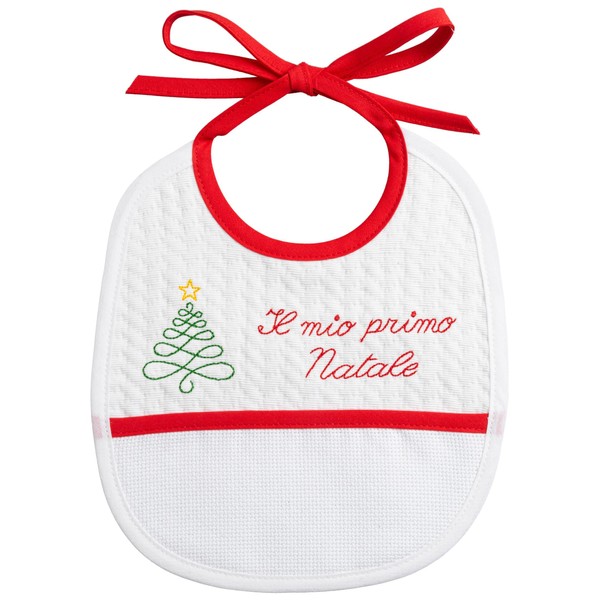 - Embroidered Christmas bib made of soft white fabric with the embroidery "il mio primo Natale" and a green Christmas tree with yellow star. White cotton bias binding, red ribbon closure. It measures 20 x 22 cm. Preferably hand wash.