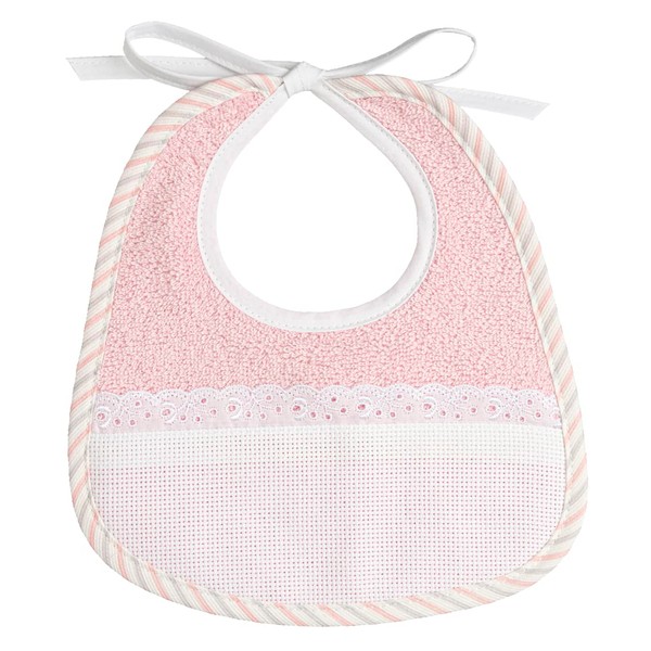 - Soft terry cotton bib in pink (385 g/m²) with embroidered Aida canvas pocket, separated from the back of the bib by an elegant lace, cotton bias binding, multi-coloured stripes, closure with white cotton ribbons.