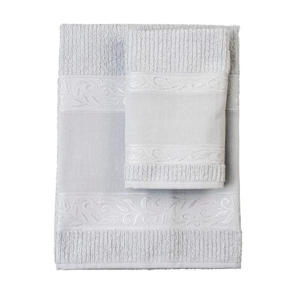 - Features: the set consists of a 60 x 105 cm towel and a 40 x 55 cm guest towel in pearl grey, made of soft terry cloth made from 100% cotton with an embroidered Aida band, weight 385 g/m². This pair of towels features a 55-hole Aida band on both towels (varying in heights: 8cm on guest towel; 12cm on face towel) framed by an elegant border with a shiny embossed jacquard pattern.