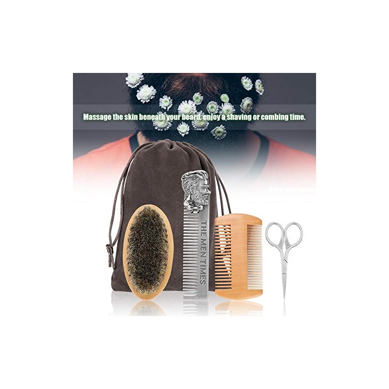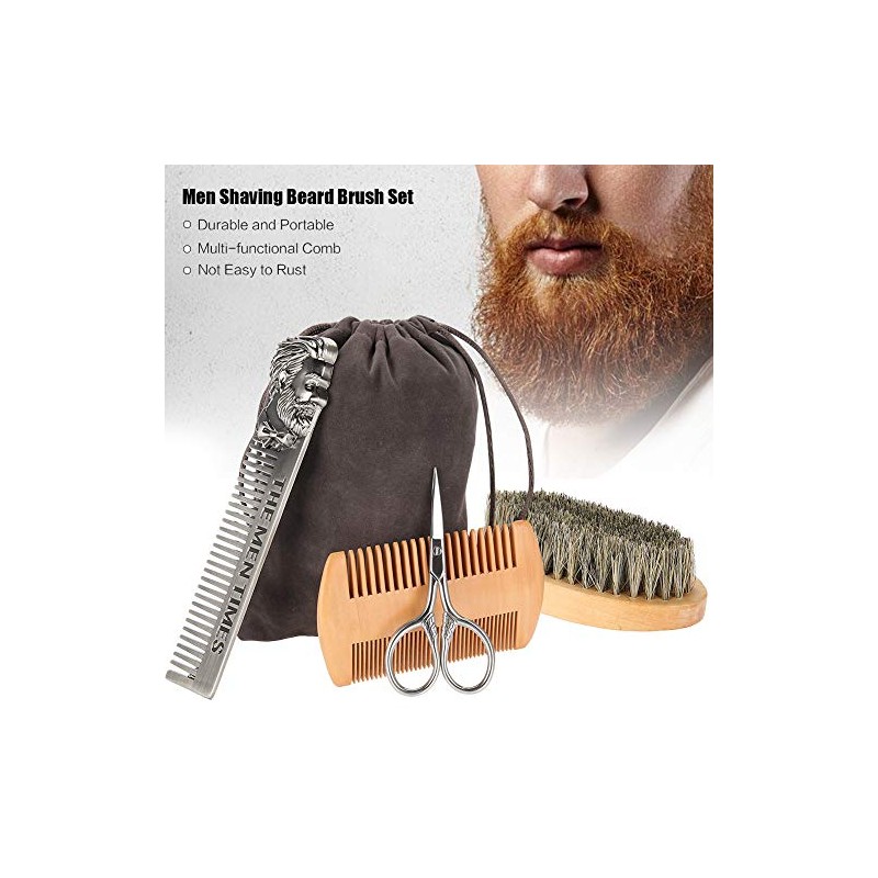 Filfeel Set de cepillo para barba 4pcs, Cepillo de barba para hombre y juego de peine de barba con peine de acero inoxidable, tijeras, peine largo,...