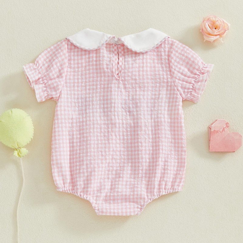Filgriox Newborn Baby Girl Romper Bow Embroidery Peter Pan Collar Short Sleeve Bubble Bodysuit Summer Clothes (Heart Pink, 0-3 Months)