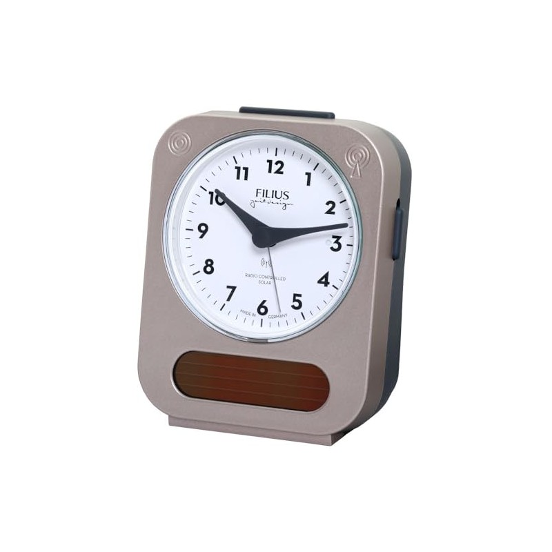 Made in Germany, radio alarm clock with analogue time display, silent UTS radio with solar operation, no battery change required, reception of the DCF77 time signal, out of range of this radio signal, quartz accurate transmission, rising alarm signal, automatic alarm (snooze). ), white dial, black hands, subtle blue all-round lighting, black plastic case with bronze front, size 12.5 x 9.5 cm. 5 x 4.5 cm, with solar panel and battery, 1800 mAh 1.5 V