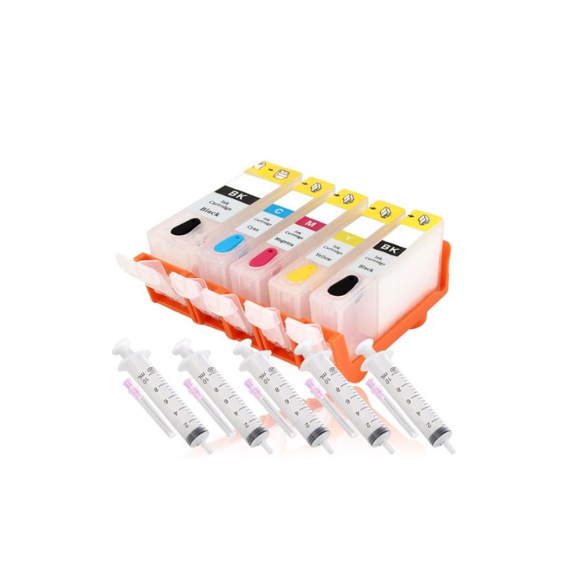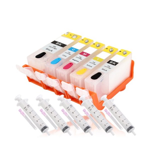 - 5 cartridges compatible fillable/replaced Canon PGI520BK, CLI521BK, CLI521C, CLI521M, CLI521Y with auto reset chip - no chip resetter necessary