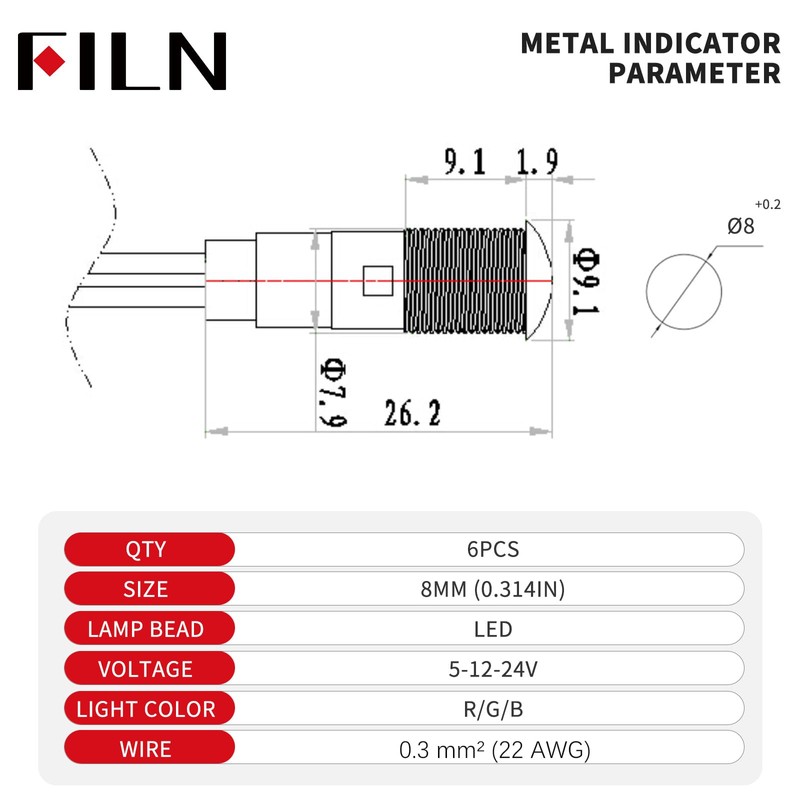 - [Specifications] FILN LED indicator light, mounting hole diameter (threaded position is mounting hole, not lamp base): 8 mm (5/16"), voltage: 12-24V AC/DC, cable length: 20 cm, overall length: 40 cm, service life: 10,000 hours.