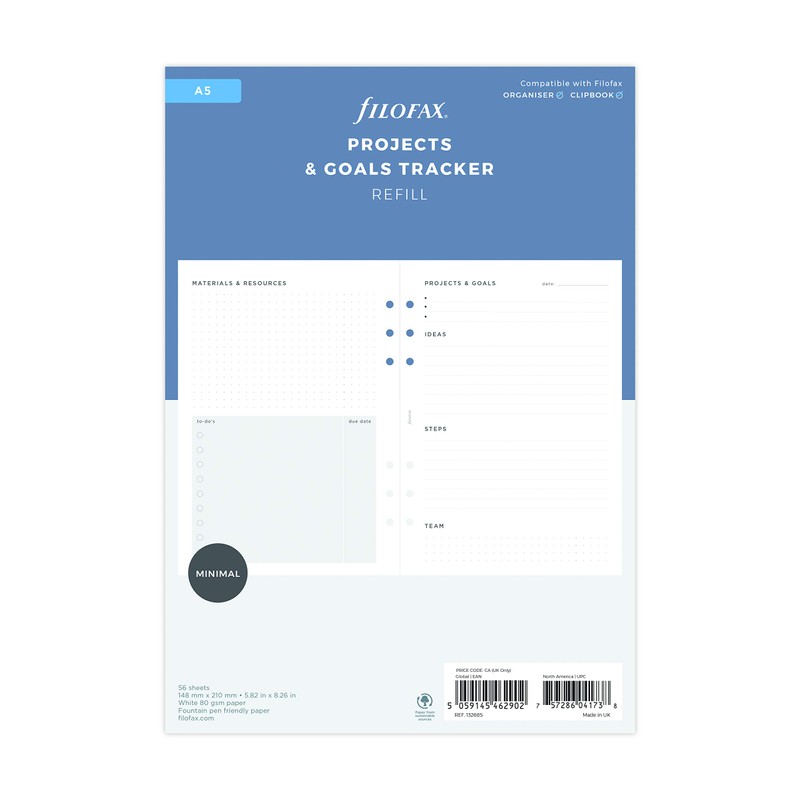 • Set goals and prioritize tasks with our Projects & Goals Tracker. Fits Filofax A5 size organisers and clipbooks 56 sheets