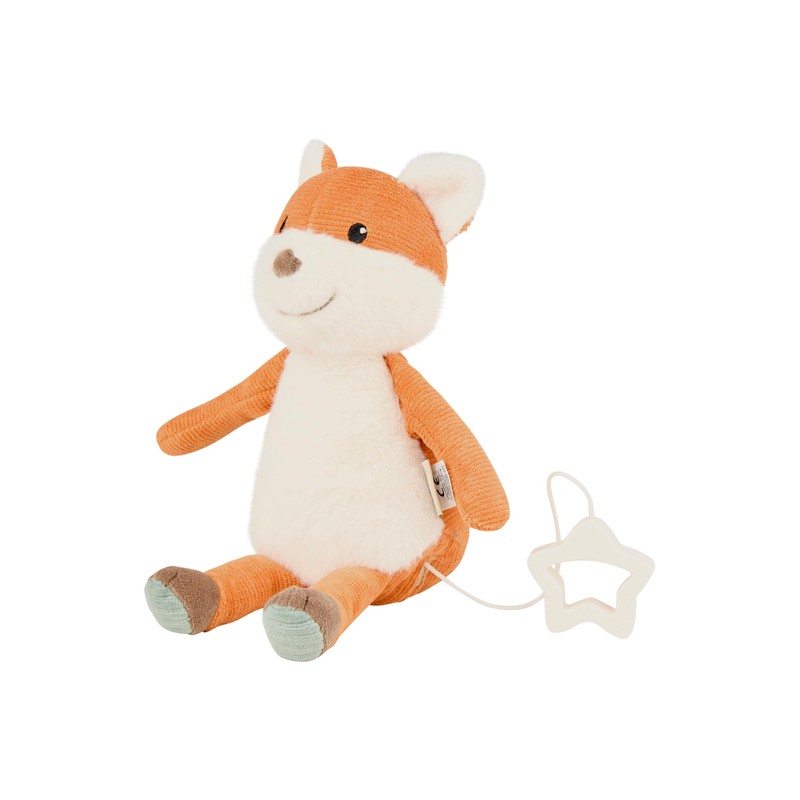 • Music box M fox Filou. Made of soft cord and fleece. The zip makes it easy to remove the musical mechanism and the figure is easily washable. Melody: Mozart's lullaby. Star handle