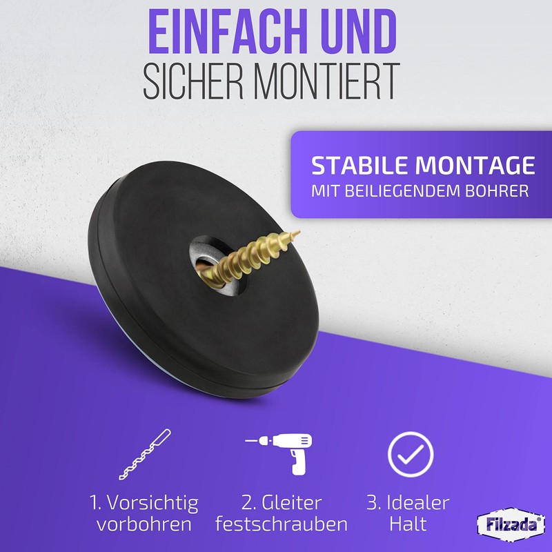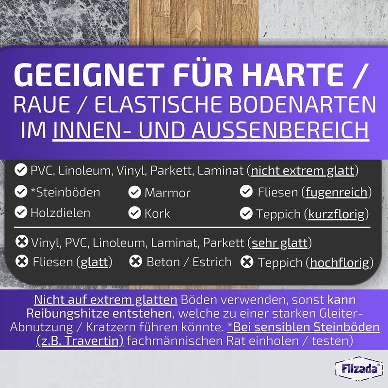 The Teflon gliders from Filzada are suitable for: laminate, tiles, marble, vinyl, PVC, cork, natural stone, carpet, rough tile, stone floor, plaster