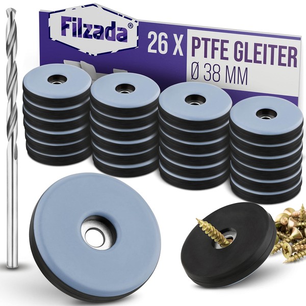 Filzada® 26 x Teflon Gliders for Screwing – Diameter 38 mm (Round) – Furniture Glides / Carpet Glides PTFE (Teflon) with Screws