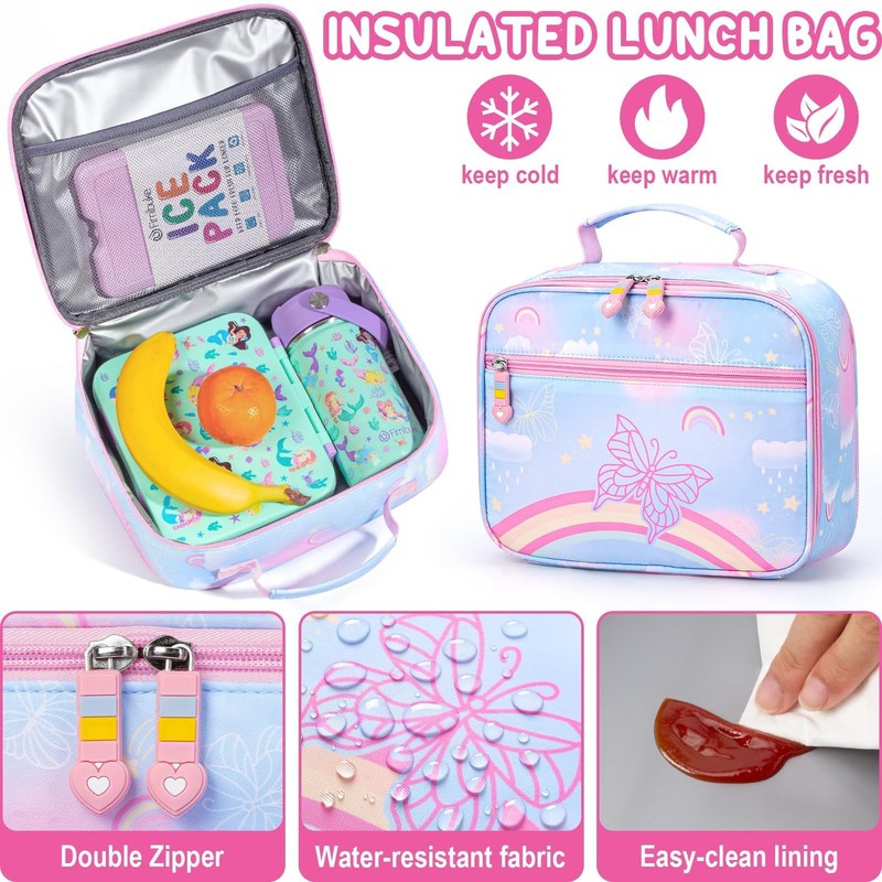 - 3PCS School Backpack for Girls Set: Fimibuke kids school backpack for girls set provides an one-stop solution for kids going to school, which can carry everything they need from books, stationery to lunch box. 3-IN-1 school bag set comes with a rainbow & butterflies girls backpack, an insulated lunch bag & a pencil case is perfect Kindergarten, elementary, middle school back to school supplies for 5-13 years old girl. WARNING: CHOKING HAZARD—Small parts. Recommended Age Grading: 3+ years old