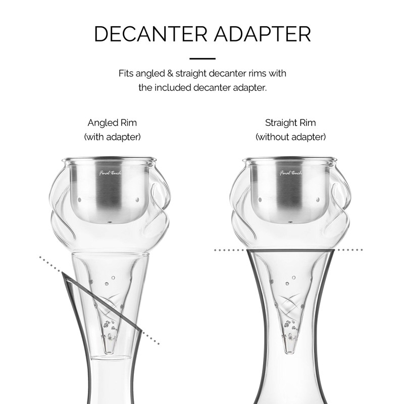 - Simply place on top of decanter a pour wine through. Fits on most decanters.