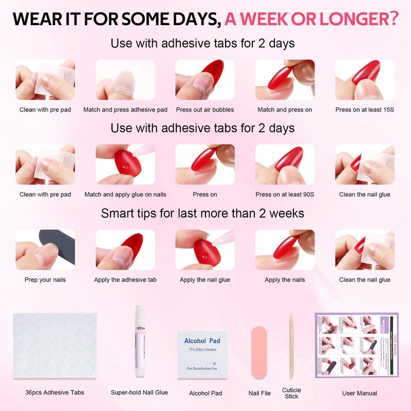 - For a Few Days or a Week? :1. Adhesive tabs is perfect for date nights or small events. 2. If you want to change the design every week, using only nail glue is the best option. 3. If you want to maintain the results for more than 14 days, we recommend using nail glue and adhesive tablets together.