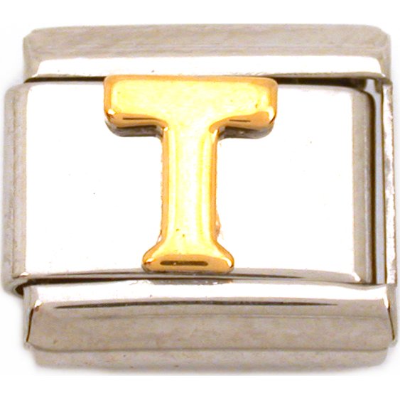 This is a beautiful new raised stainless steel letter "T" Italian charm. It is a great gift for yourself or a loved one and is the perfect addition to any jewelry collection. The letter T is gold plated.