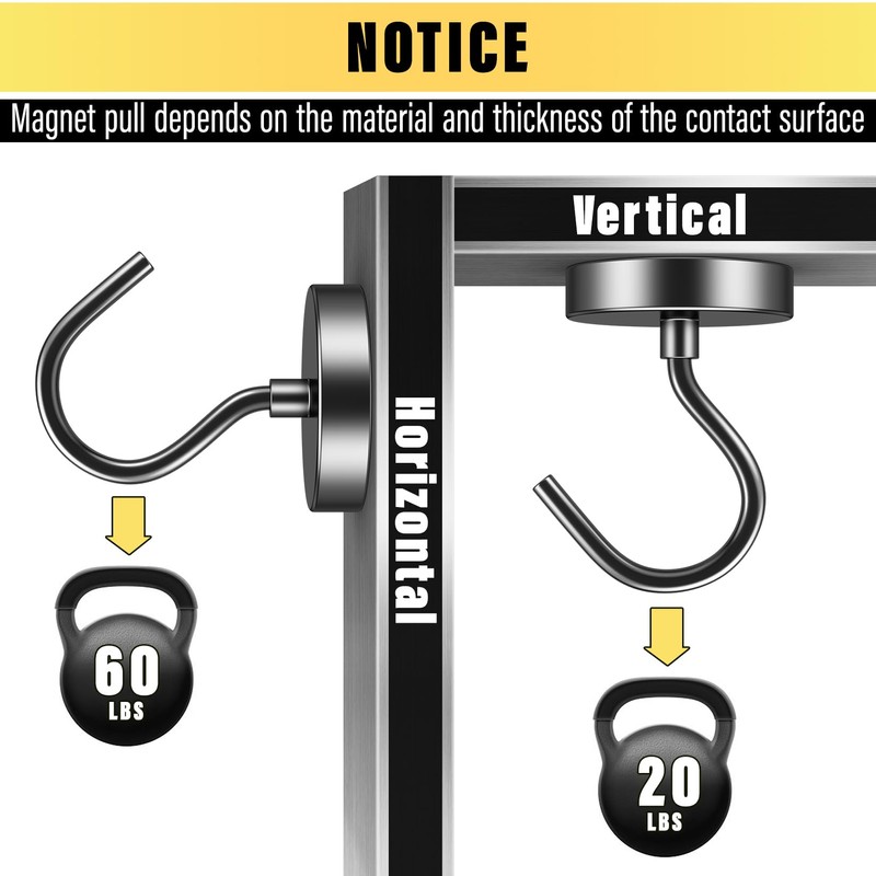 - Excellent load capacity: this magnetic hook can withstand vertical use. When used horizontally, the tensile force is physically reduced by 2/3.