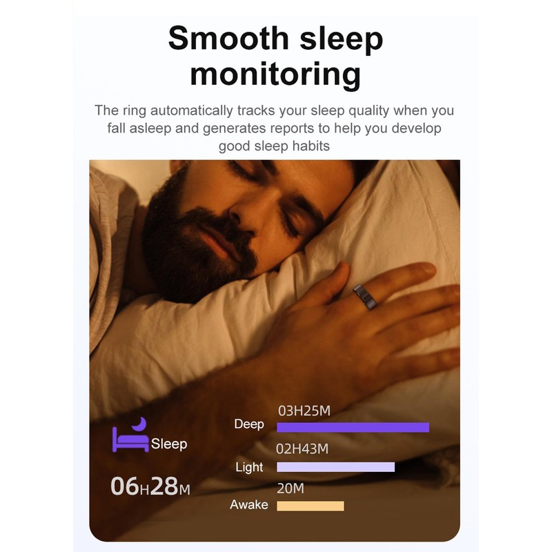 - [Get a closer look at your shut‑eye.]Adequate sleep is very important for health.The app doesn’t just keep track of your sleep. It also helps you create a schedule and a bedtime routine so you can meet your sleep goals. When you fall asleep wearing Findtime Smartring, the ring will automatically record your Deep Sleep or Light Sleep,Wake Time. You can adjust your routine, and develop good sleep habits.How refreshing.