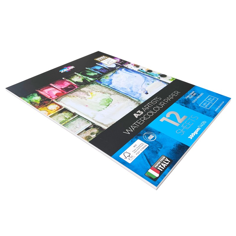 Fine-Grain Textured Watercolour Paper Pad - by Zieler® 12 Sheets | 300gsm | Ideal for 'Wet on Wet Techniques' | FSC Mix & Acid Free. Includes Starter tip Sheet (A3)