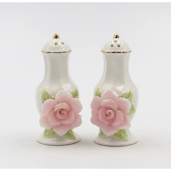 Fine Porcelain Pink Rose Salt & Pepper Shakers Set, 3-1/2" H