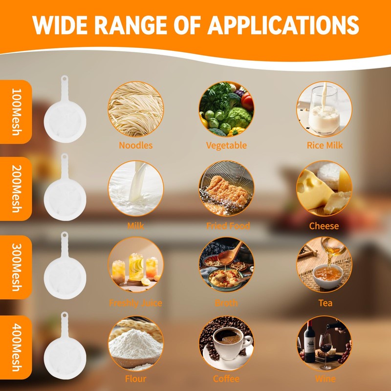 • Various specifications: the kitchen sieve plastic kitchen 100 mesh, 200 mesh, 300 mesh and 400 mesh. 100 mesh is suitable for filtering soy milk, juice. 200 mesh is suitable for filtering milk, rice milk, etc., and 300 mesh 400 mesh is suitable for filtering spirits, coffee fine wine, fine precipitation.