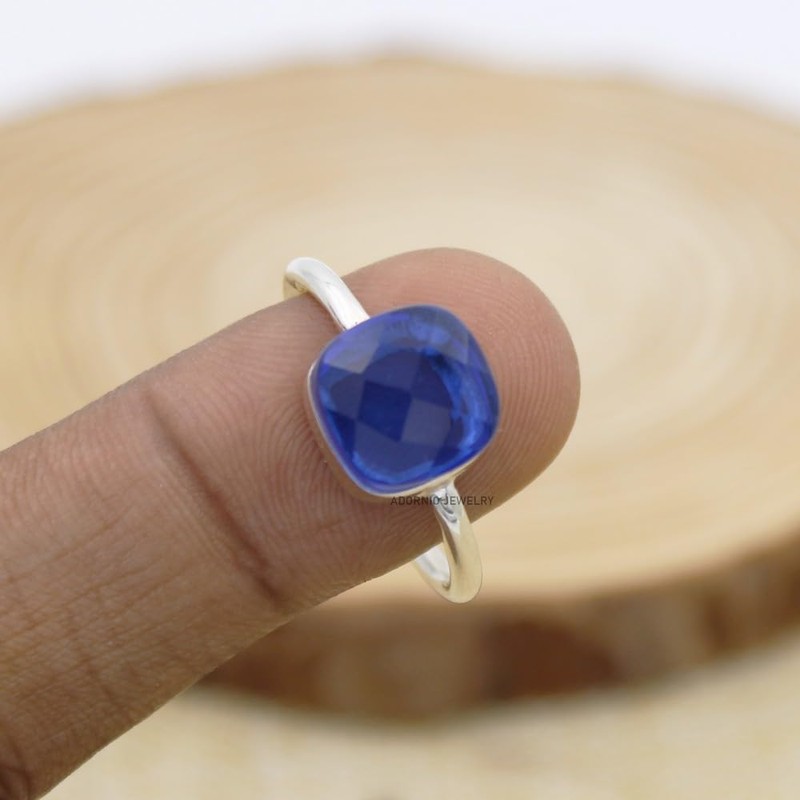 Fine Sterling Silver Ring For Womens Tanzanite Ring Sterling Silver Boho Ring December Birthstone Checkerboard Cushion Gemstone Ring