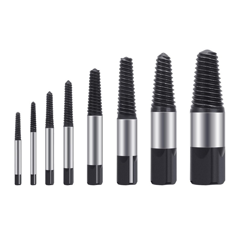 - Screw extractor set: contains 8 screw extractors in different sizes, which are suitable for a variety of screws and pipes. This kit allows you to effortlessly remove damaged or broken screws and pipes, regardless of their size or type.