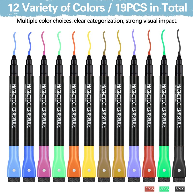 FINEASY Pack of 19 Magnetic Whiteboard Markers, Whiteboard Pens with Sponge, Dry Wipe Markers with Pen Clip, Dry Erase Marker with Fine Tip for Home, School and Office (12 Colours)