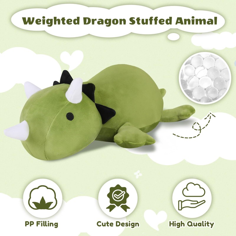 - Versatile Functionality: The weighted dino plush serves more than just as a cuddly toy—it doubles as a charming decorative piece. Perfect for bedrooms, living rooms, homes, offices, or any space you desire, it brings a touch of joy and whimsy to your everyday life.