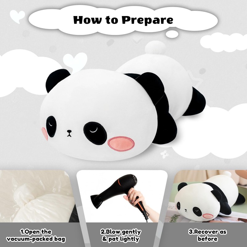 - Reminder: In order to ensure the best user experience, our panda plush toys are vacuum-sealed during transportation. After opening the package, if the plush fibers are compressed, we recommend gently patting them with the palm of your hand.