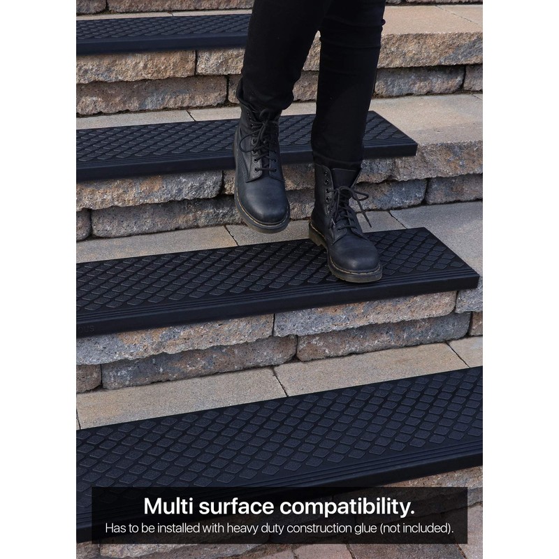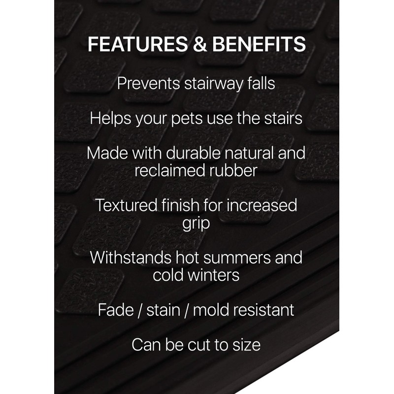 Please measure your stairs to verify sizing (can be cut to fit your needs).SAFETY FIRST: The rubber treads are designed to keep your stairs and surfaces safe all year round. The textured surface design provides additional safety with its improved traction. SAFE FOR PETS & BARE FEET: Our rubber treads are not too rough to damage the paws of your pets or bare feet. The gritty surface provides just enough traction to keep you and your loved ones safe.WATER RESISTANT FOR OUTDOOR USE: Tested in numerous conditions, the rubber treads stand the test of time and weather conditions (snow and rain). LOW MAINTENANCE: Once installed, the rubber treads will not give you any additional maintenance tasks aside from removing snow and ice as you usually would.