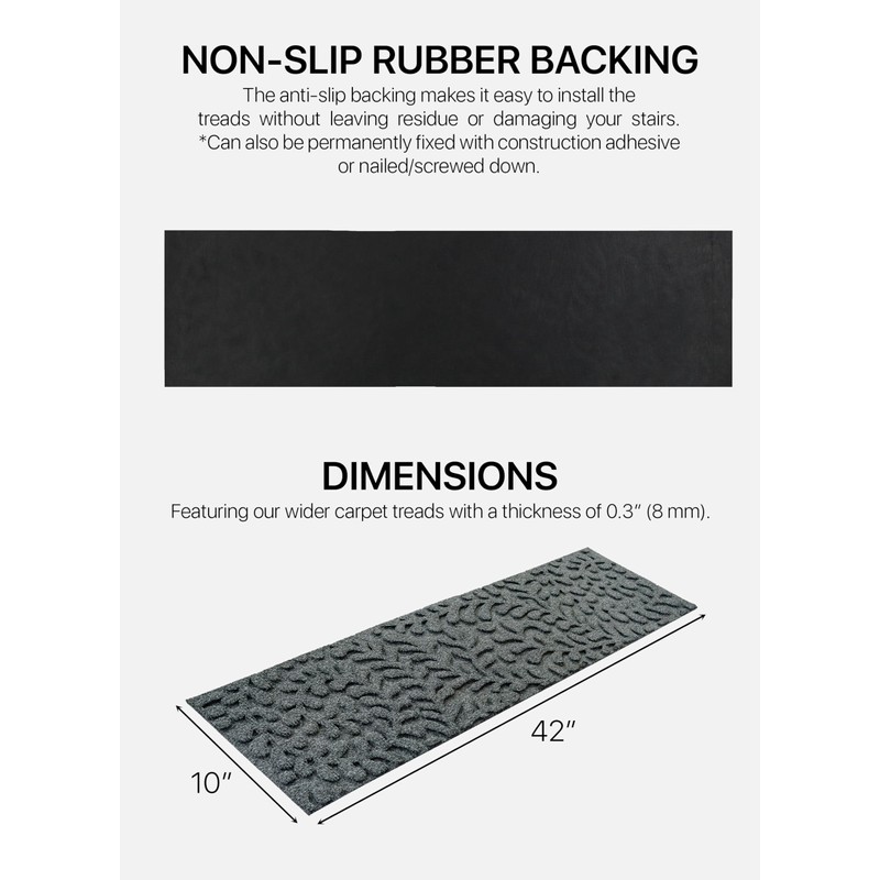 - Cover larger area: Reduce slippery areas and increase safety by covering a larger stair surface with 42 inch wide no-slip rubber backing carpet stair treads; can also be cut to fit your exact dimensions