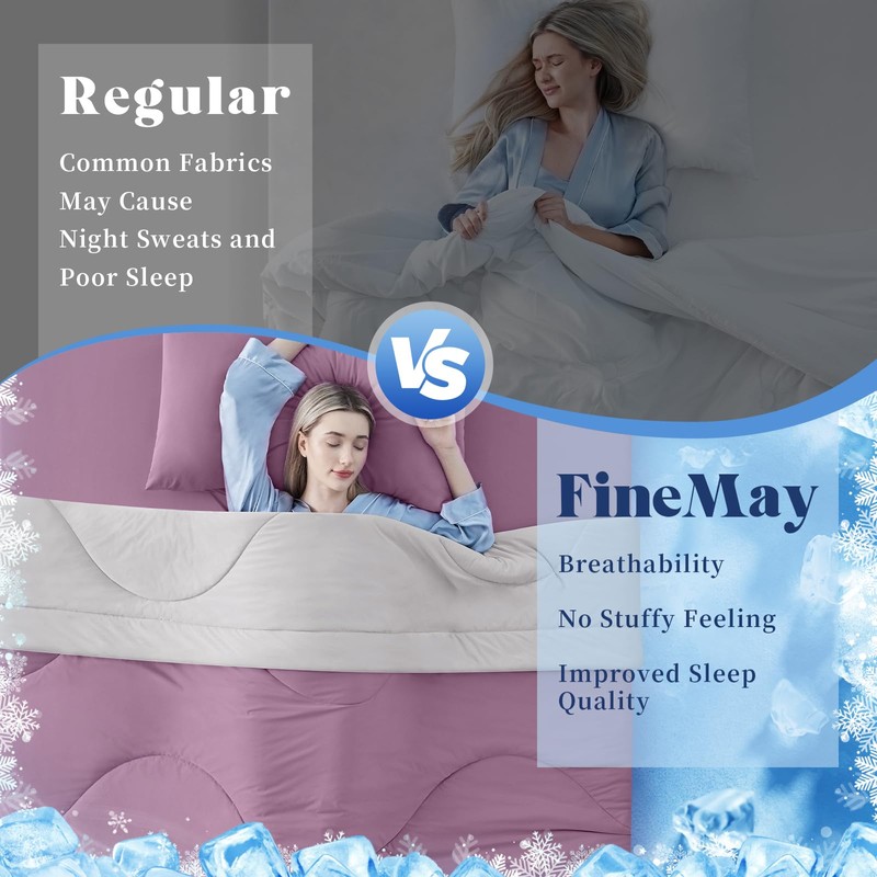 Cooling ComforOur Cooling Comforter is the ultimate solution for hot sleepers, offering a refreshing and comfortable night’s sleep. With FineMay heat-dissipation technology, this comforter absorbs body heat and wicks away moisture instantly, keeping you cool and dry throughout the night. No more tossing and turning! Feel like you’re wrapped in a cloud. Made with silky-smooth, OEKO-TEX certified materials, this comforter is gentle on sensitive skin and safe for pets. It’s perfect for managing menopause heatwaves or pregnancy night sweats, providing unrivaled comfort. The 3D hollow fiber fill creates a breathable cocoon, adapting to your body’s temperature. The open-cell weave enhances airflow, keeping you cool in summer and cozy in winter, while resisting clinginess for a more comfortable sleep. Machine washable and resistant to pilling, clumping, and pet hair, this comforter stays fresh and fluffy after every wash. Perfect for busy families and pet owners who need convenient, low-maintenance bedding. FineMay's cooling comforter blends luxury with practicality, designed for hot sleepers and those experiencing hot flashes. It ensures a cool, refreshing sleep all year round—an ideal gift that provides restful sleep, night after night. Experience the perfect blend of comfort and convenience—sleep cool, wake refreshed!ter for Hot Sleepers