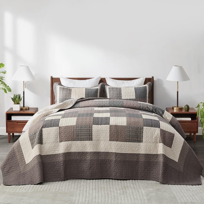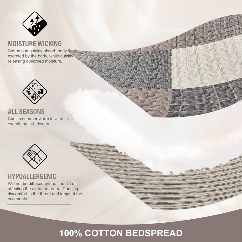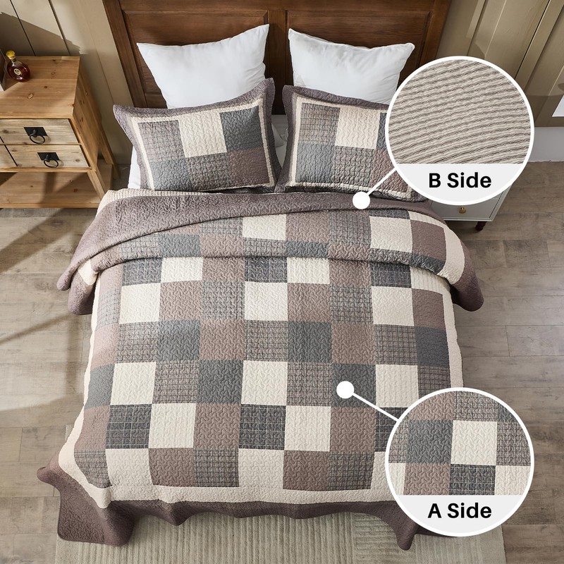 - [Unique Design] This reversible bedspread features an engineered plaid pattern in soft tones of warm browns, beige, and black, while the reverse showcases a complementary solid brown stripe. The quilted stitching accentuates the texture, creating a unique look that complements farmhouse or country interiors