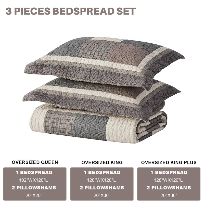 - [Real Oversized Bedspread!!!] Designed to perfectly drape extra large or tall beds including beds with box springs or thick mattresses, this oversized queen quilt covers all sides, eliminating embarrassing gaps. This bedding set includes 1 bedspread: 102" x 120", 2 matching pillow shams: 20" x 28"