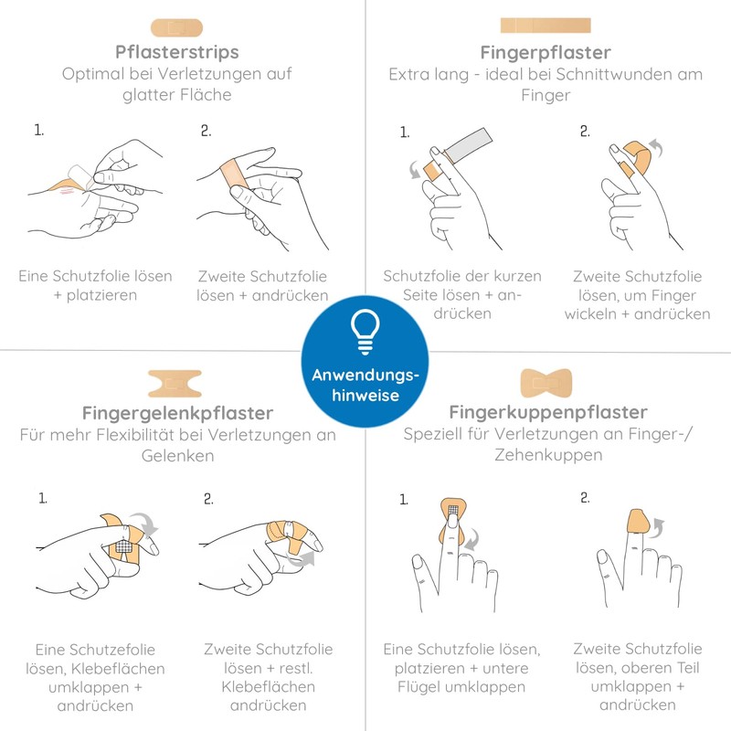 - Extra long plaster stripes: with a length of 12 x 2 cm, the plasters are particularly long and are therefore ideal for injuries to the finger and for many other parts of the body.