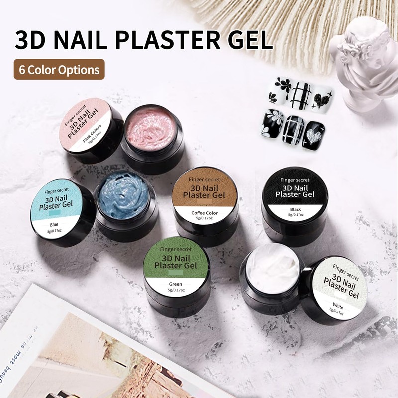 - 3D Nail Plaster Gel Kit:contain 1 3D Nail Plaster Gel and 1 nail brush Our 3D Nail Plaster Gel is specially designed to help you craft unique, long-lasting 3D nail designs.