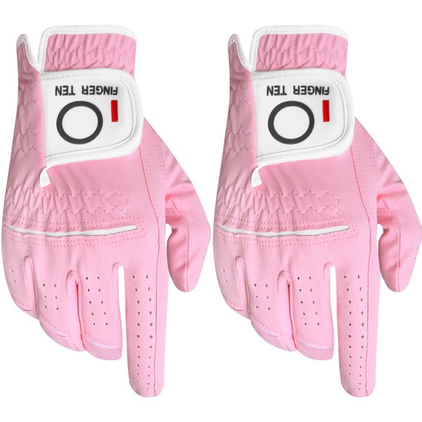 FINGER TEN Golf Gloves Ladies Left Hand All Weather Soft Rain Grip Value 2 Pack, Women Golf Glove Flexible Wear Resistance for Perfect Swing (S, Worn on Right Hand-Pink)