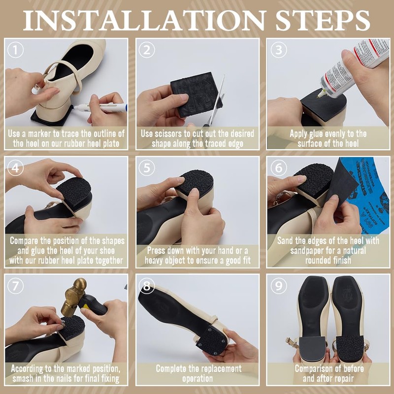 - Rubber Material: This shoe repair patch is made of rubber, which is comfortable to use and can be worn for a long time; It provides extra grip and support for your high heels, making it easier for you to walk without slipping or tripping.