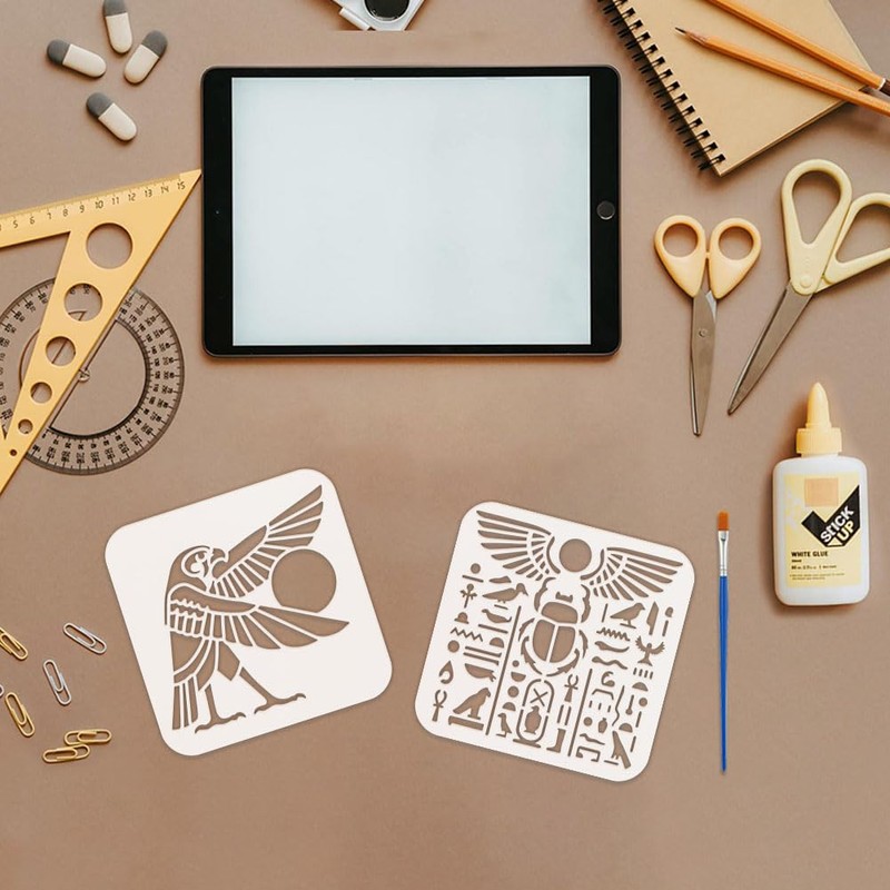 - Package & Size: This set of PET stencils contains 6pcs different Egyptian motifs, 1 piece for each motif, the size of a single piece is about 15x15cm/5.9x5.9 Inch, and also comes with a paintbrush, which is convenient for you to create, a set of Egyptian themed paintings can be started in the hands of the journey.