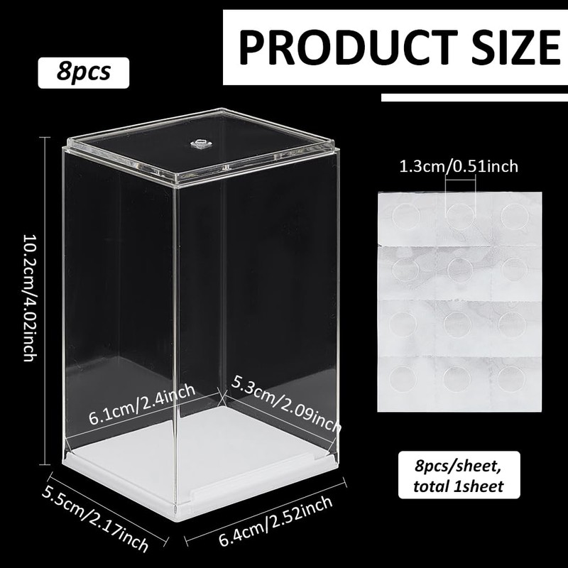 - Package & Size: You will receive 8pcs Plastic Action Figure Display Cases with 8pcs traceless adhesive pads for attaching to the feet of the doll, making it stand steadily and not fall when tilted. Its overall dimensions are about 2.17 inch(5.5cm) wide, 2.52 inch(6.4cm) long, 4.02 inch(10.2cm) high, inner diameter are about 2.40x2.09 inch(6.1x5.3cm), sticker: 0.51 inch(1.3cm).