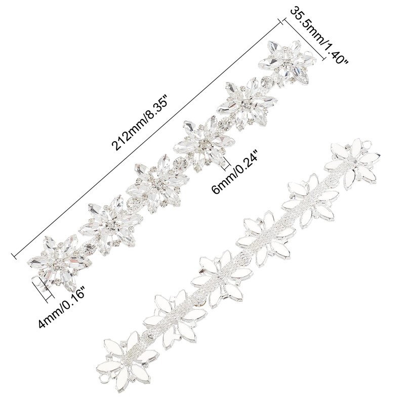 - Shiny flower: Our rhinestone appliqué is characterised by exquisite workmanship, six connected flowers on the base chain, each with pointed 6 petals, and a small circular rhinestone decoration in the middle of each two flowers.