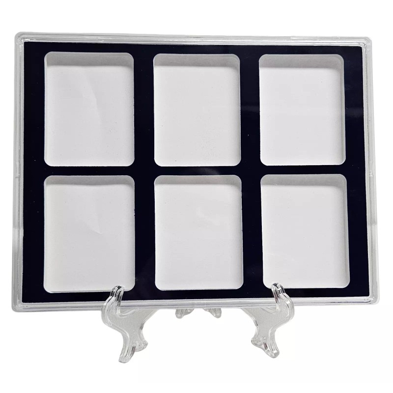 This high-quality storage case is perfect for keeping your valuable coins safe and organized. Made from durable Acrylic PMMA material and featuring a clear transparent design, this case allows you to easily view and display your coins without having to remove them from their slabs. Included are 6 certified slab holders with 18mm translucent inserts to hold your Roosevelt, Mercury, Barber, Liberty Dimes or 18mm Coins . Labels are also included. The transparent design allows viewing obverse and reverse of the coin. Reversible from blue to white. Designed to fit PCGS slabs, this case is suitable for a wide range of coin types and sizes. With a sturdy construction this case will help ensure that your coins remain in pristine condition for years to come. Whether you're a serious coin collector or just looking for a safe way to store your coins, this storage case is the perfect solution. Includes stand. Coin pictured is not included - for display purposes only.