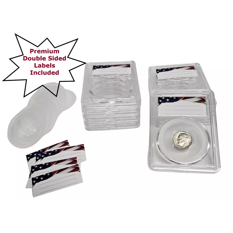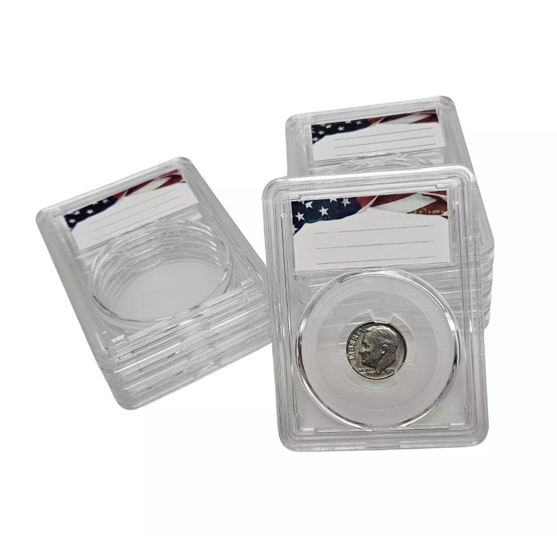 - Each slot is tailored to securely hold your certified style holders, ensuring a snug fit for your Roosevelt, Mercury, Barber, Liberty Dimes or 18mm Coins . Additionally, custom labels, included, can be easily incorporated to personalize the presentation of your coins, adding a unique touch to your display. This case accommodated PCGS certified slab holders.