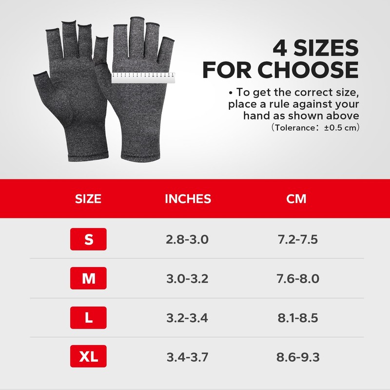 - Enhanced Grip and Dexterity: Our arthritis gloves have 4 sizes. Choose your fit size and it will conform to the natural shape of your hand, plus cotton material enhances grip. The fingerless design allows for full range of motion and the opening is set to an optimal length for effective compression support, providing the perfect balance for mobility between fingers and thumb.