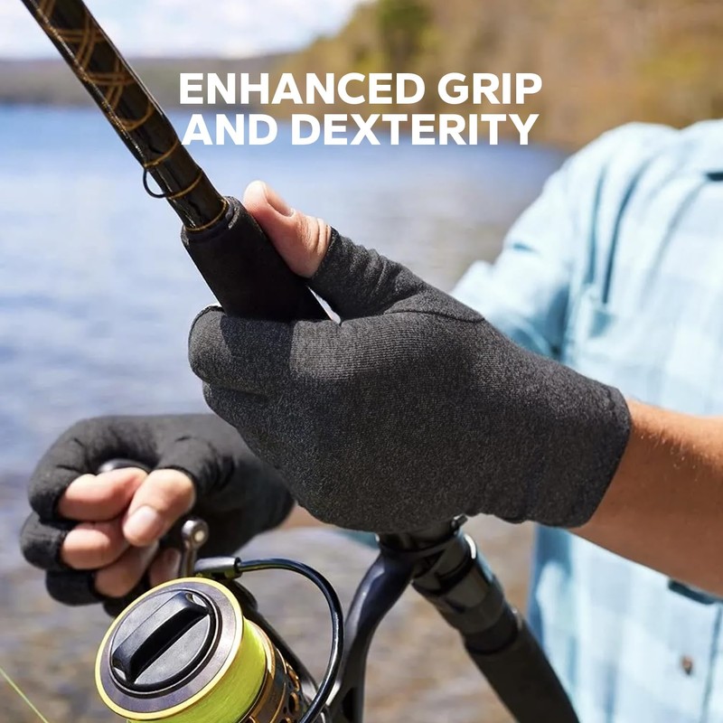 The soft compression gloves relieve arthritis pain by reducing stress on pressure points in the fingers, hands and wrists.