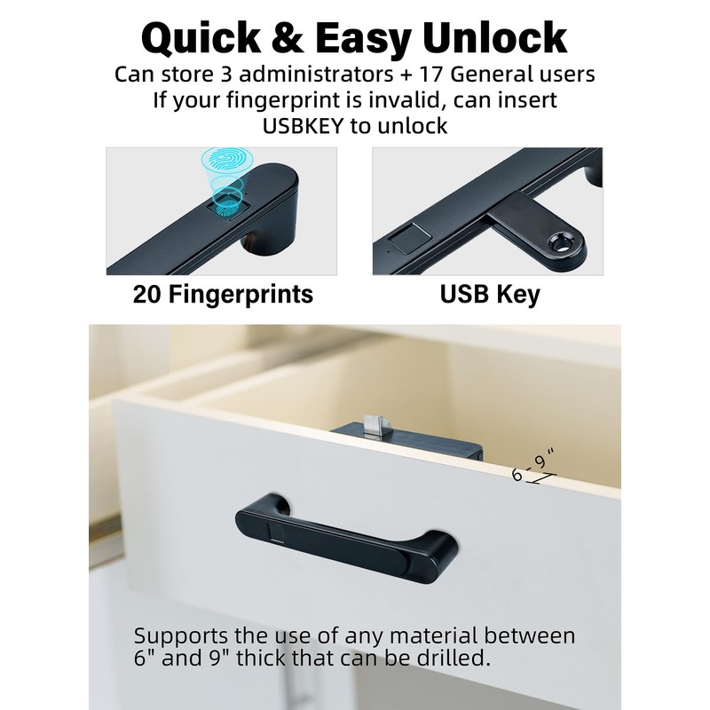 - ๐ใ๐ค๐จ๐๐๐ ๐จ๐ก๐๐ข๐๐ใUnlock your device in just 0.5 seconds with our cutting-edge biometric technology; no card, key, app or Bluetooth connection necessary. With up to 3 administrator accounts and 17 normal user accounts, you'll always be in control. And if your fingerprint is damaged, simply use a spare USBKEY to unlock.