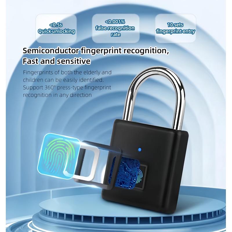 - ➤【Quick automatic identification technology】: 0.5 seconds to unlock, fast identification technology, each door padlock lock stores 20 fingerprints, the smart fingerprint padlock supports fast 360-degree angle fingerprint recognition, more friendly to children and the elderly.