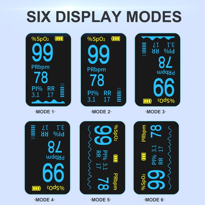 - Smart Visuals: Experience clear, vibrant readings with a versatile OLED HD display featuring 6 visual modes and 4 auto-rotating orientations. Designed for life, it adapts seamlessly to your lifestyle—whether you’re resting, moving, or in changing light—providing effortless visibility of SpO₂, PR, PI, and RR.