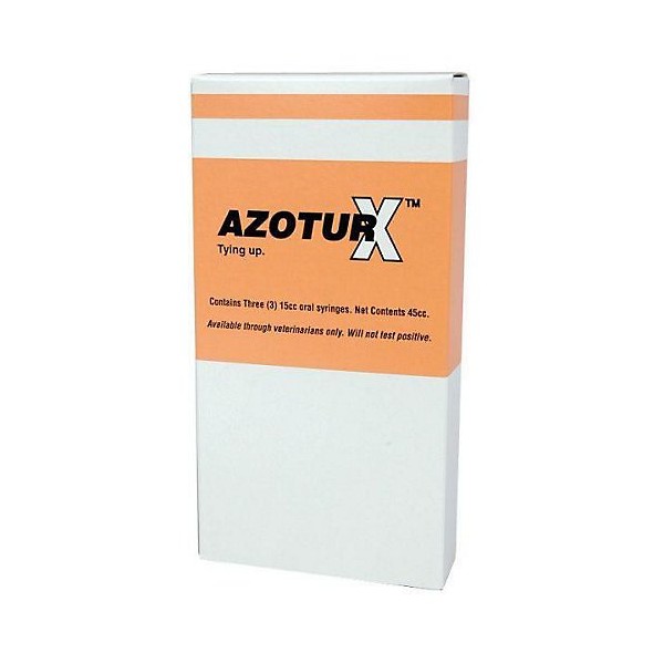 Azotur-X 15cc Syringes Azoturx is an all natural oral treatment for treating azoturia. One treatment will stop a horse from tying-up for approximately 30 days. Features: Stops tie-up syndrome Alleviates body soreness Improves locomotion. Calms nervous horses All natural ingredients Will not test Item Specifications: Sold in box of three 15cc oral syringes Active Ingredients: 1400mg/ml Thiamine Mononitrate,1000mg/ml Pyridoxine HCI 700mg/ml d-Calcium Pantothenate 600mg/ml Riboflavin 1mcg/lb Vitamin B12 15000mg/lb Niacinamide Directions for Use: Administer 1st syringe in the morning, after feeding. Administer 2nd syringe 24 hours later, also after feeding. Administer 3rd syringe 48 hours after 2nd treatment following feeding. Repeat monthly or as needed according to each individual, usually 2-6 weeks.