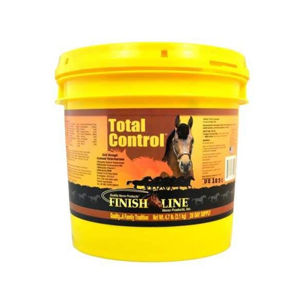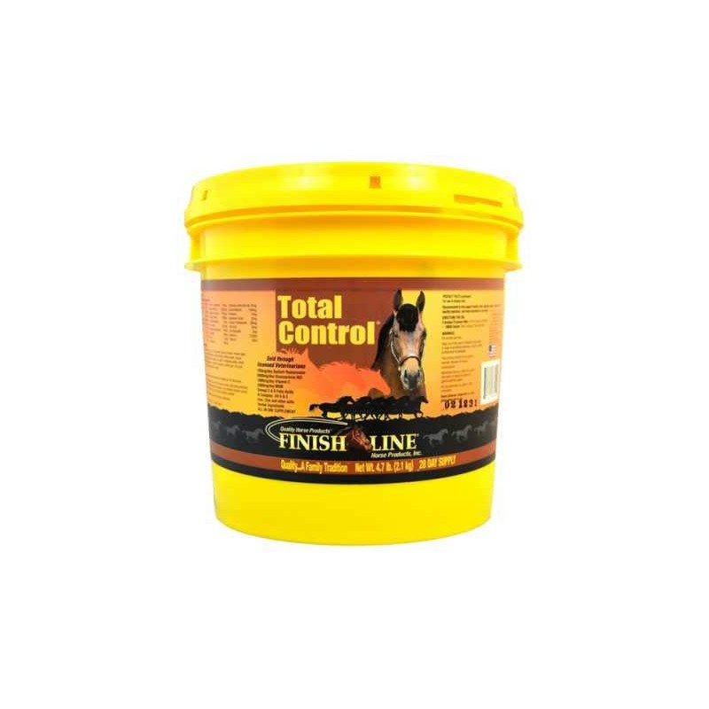 Finish Line(R) TOTAL CONTROL(R) New Complete Supplement that supports six horse systems: j points, feet, coat, gastric system, blood counts, rehydration TOTAL CONTROL(R) is a supplement designed specifically for Performance Horses, and is formulated to combine the active ingredients of five Finish Line Horse Products, all into one appetizing, daily supplement. TOTAL CONTROL(R) has the following benefits for your horse: Promotes blood counts Encourages healthy joints and bone Helps develop strong hooves Improves hair and skin Assists in the replenishing of electrolytes Aids in maintaining a healthy digestive system TOTAL CONTROL(R) is the ALL-IN-ONE Supplement for your horse! TOTAL CONTROL(R) was initially tested in 2006 by an outside veterinarian, whose main focus was in the care of Standardbred Racehorses. This same veterinarian was overwhelmed with the findings and quoted, "This is the supplement every performance horse should be on. " Secondary testing was done with over 50 Thoroughbred Trainers and Farriers with the same outstanding results. Sizes: 4. 7 lb. (28 days) 9. 3 lb. (56 days) 23. 3 lb. (140 days for one horse or 28 days for five horses)