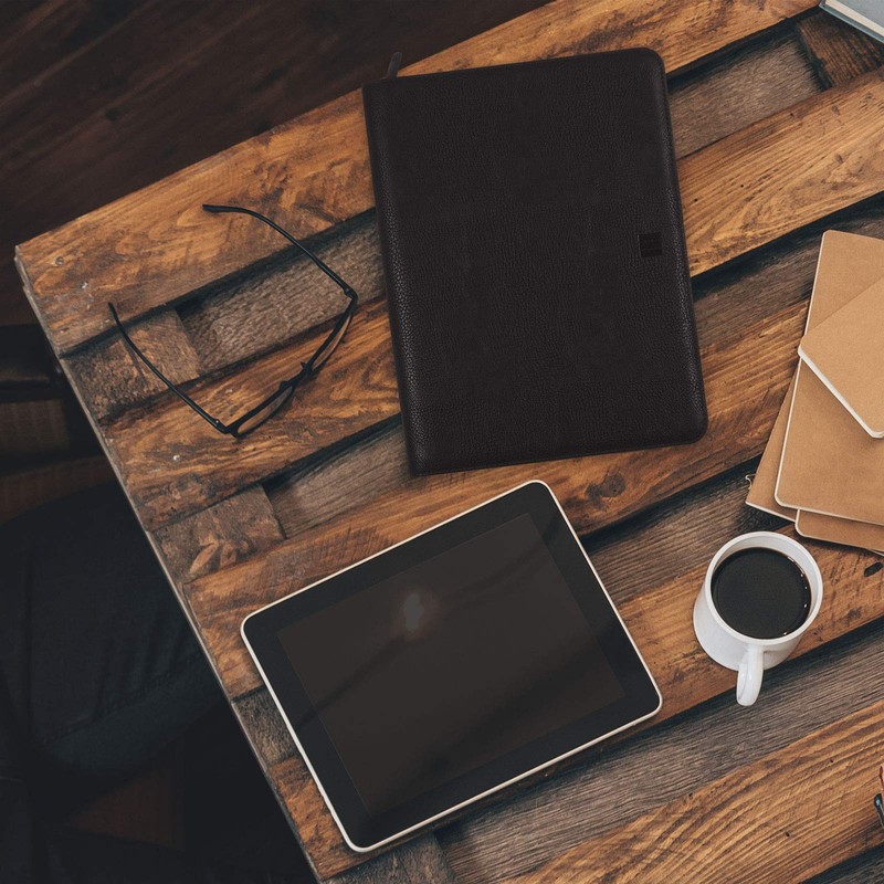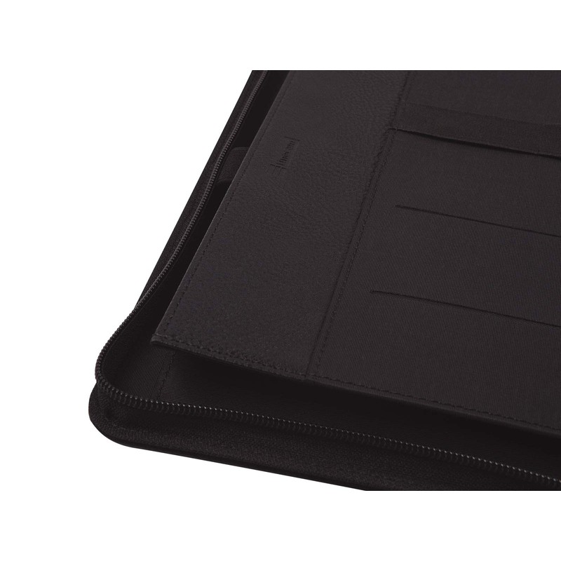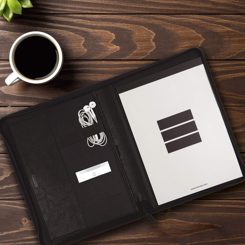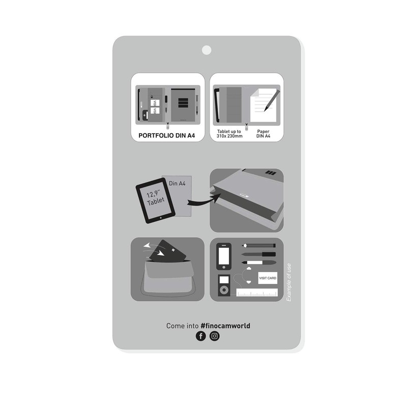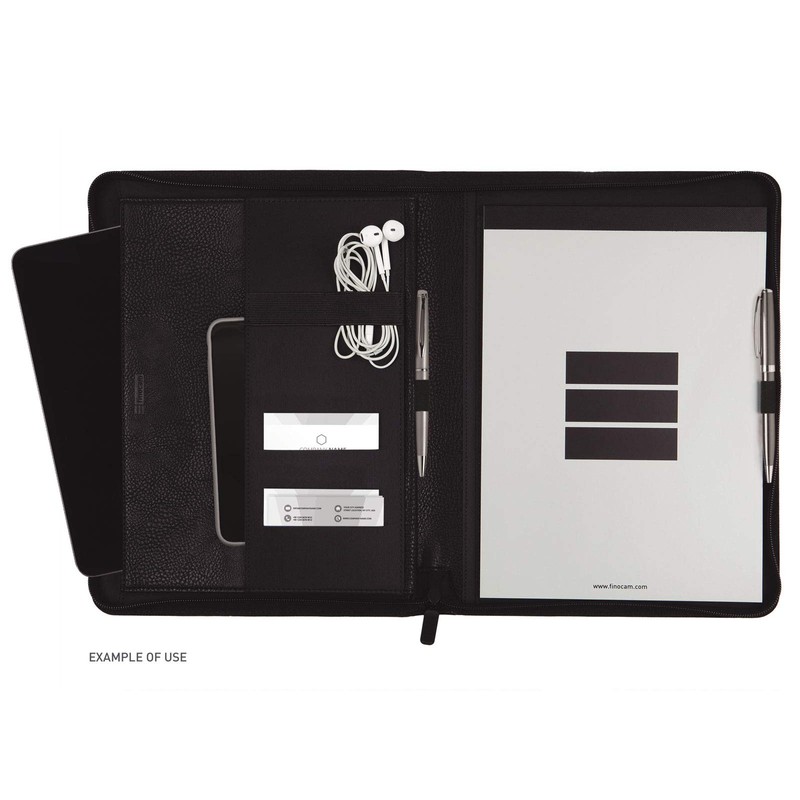 - Inner pocket with gusset. With elastic bands for holding writing utensils, mobile phones, cards and/or tablet up to 10 inches.